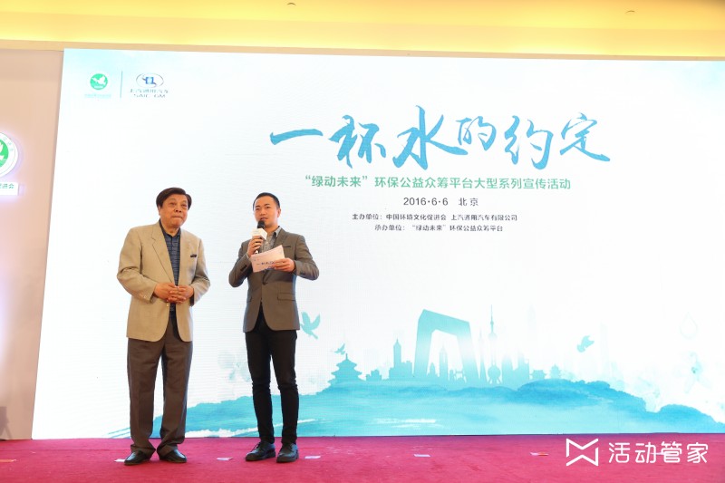 覆盖百万公众,践行“一杯水的约定”2016年6月6日上午,为纪念6.5环境日,由中国环境文化促进会和上汽通用汽车有限公司联合主办、活动管家承办,“绿动未来”环保公益众筹平台的“一杯水约定”—“绿动未来”环保公益众筹平台大型系列宣传活动在北京隆重举办。在活动现场有著名央视主持人赵忠祥老师以及白岩松老师等重要级嘉宾。
